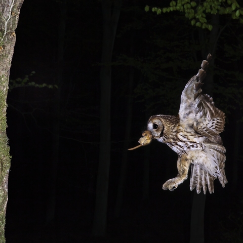 Tawny owl bringing back dormouse to nest © Dale Sutton/2020VISION